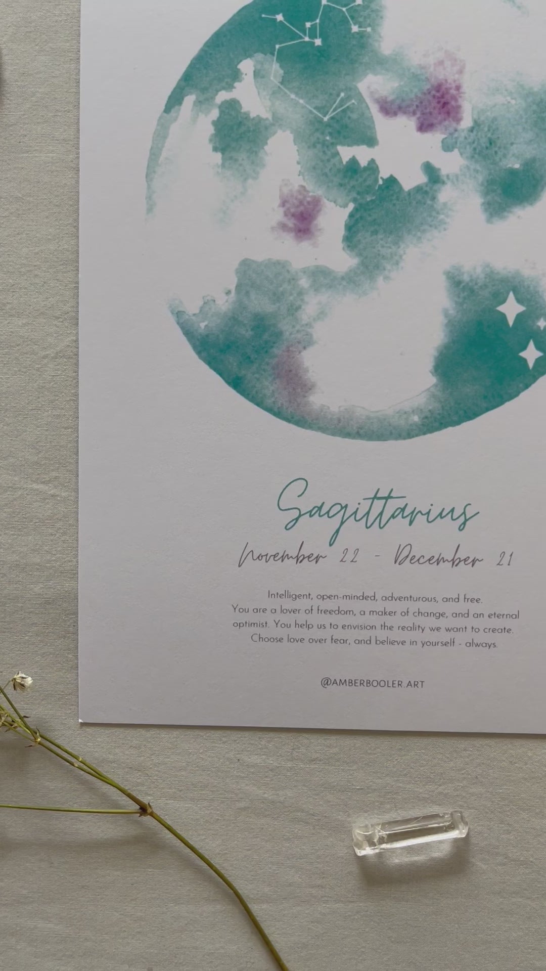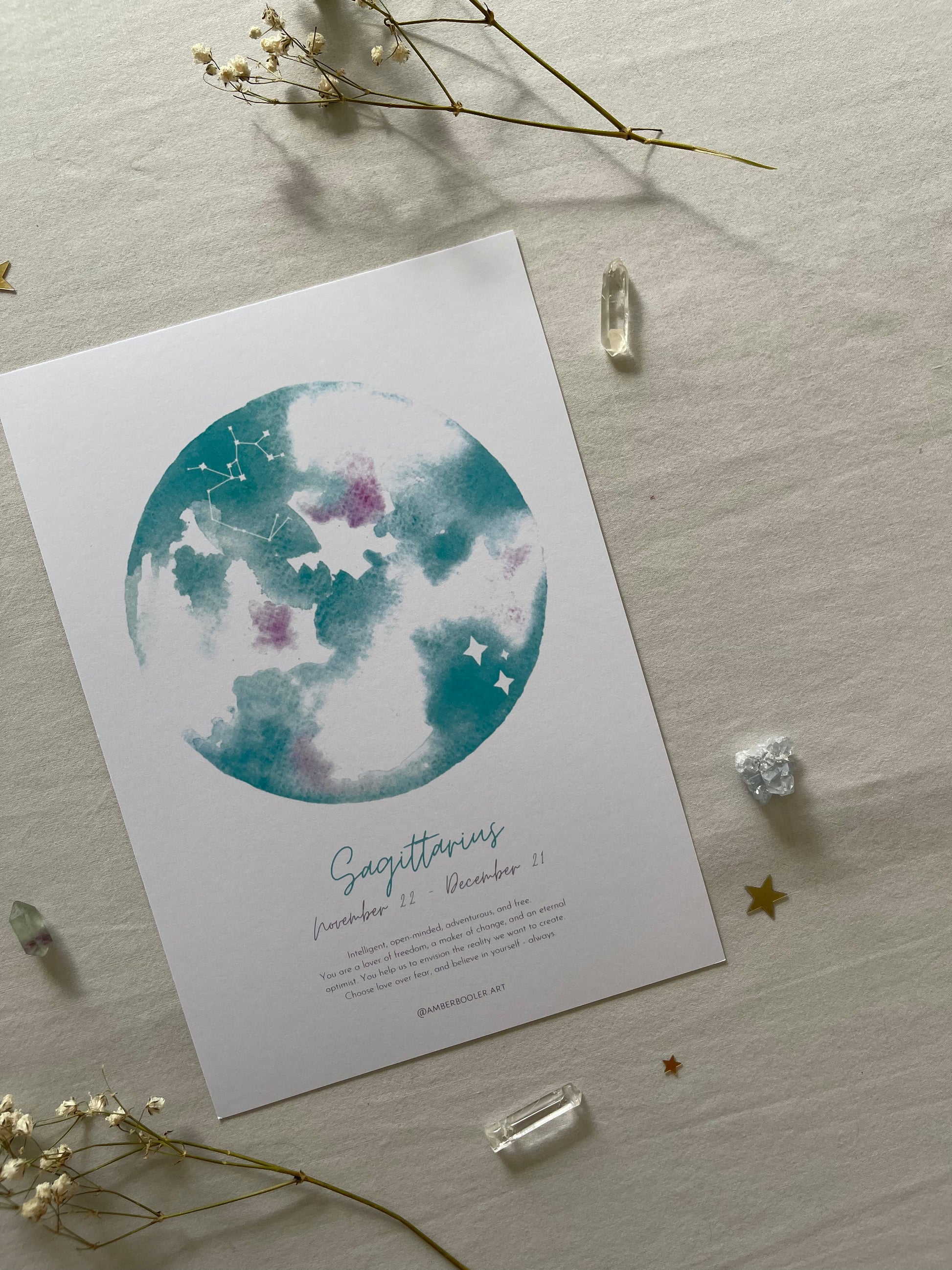 Print of an original watercolour artwork by me, featuring sign colours, star constellation, dates, characteristics and a message to the sign underneath.