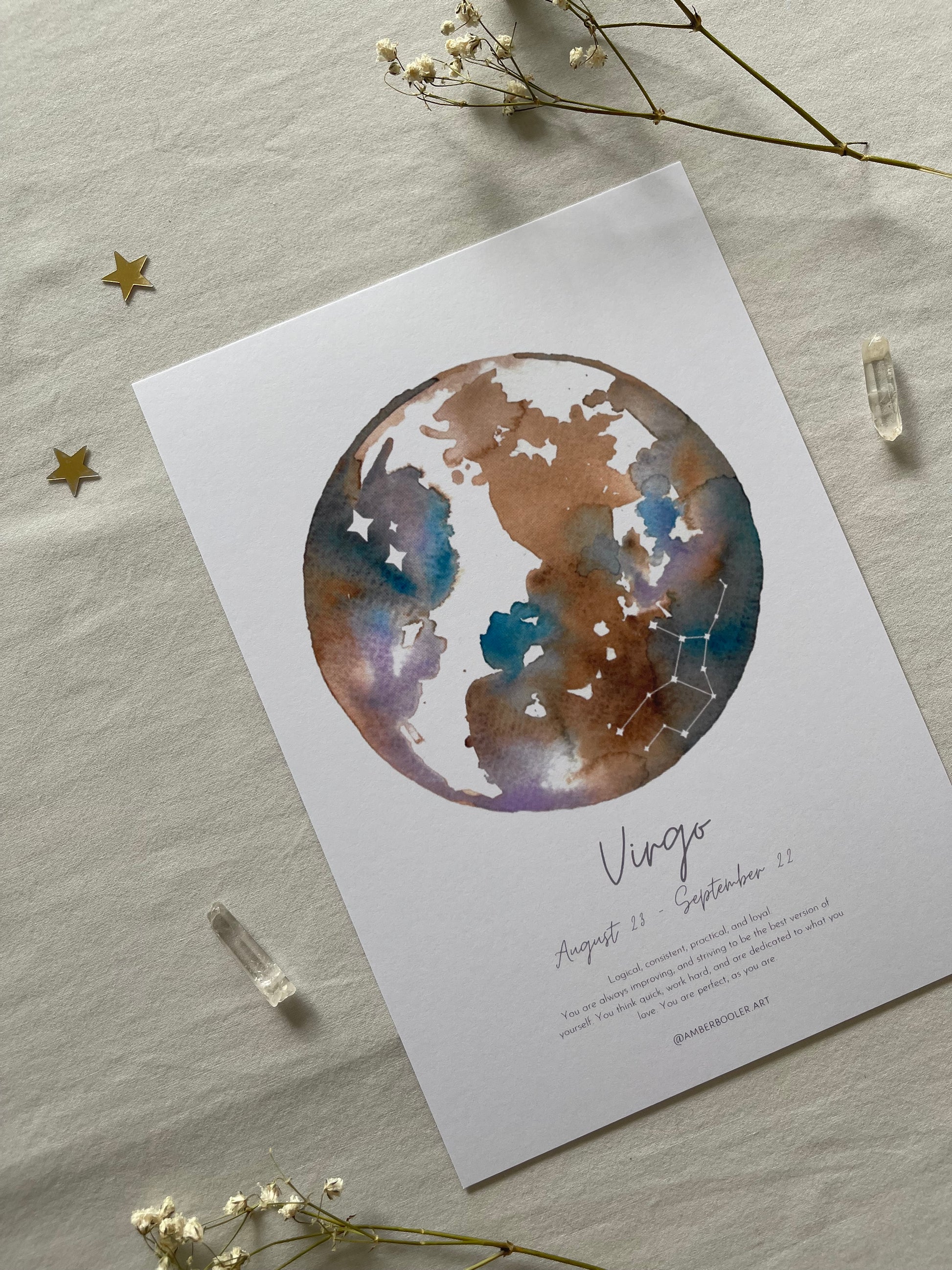 Print of an original watercolour artwork by me, featuring sign colours, star constellation, dates, characteristics and a message to the sign underneath.
